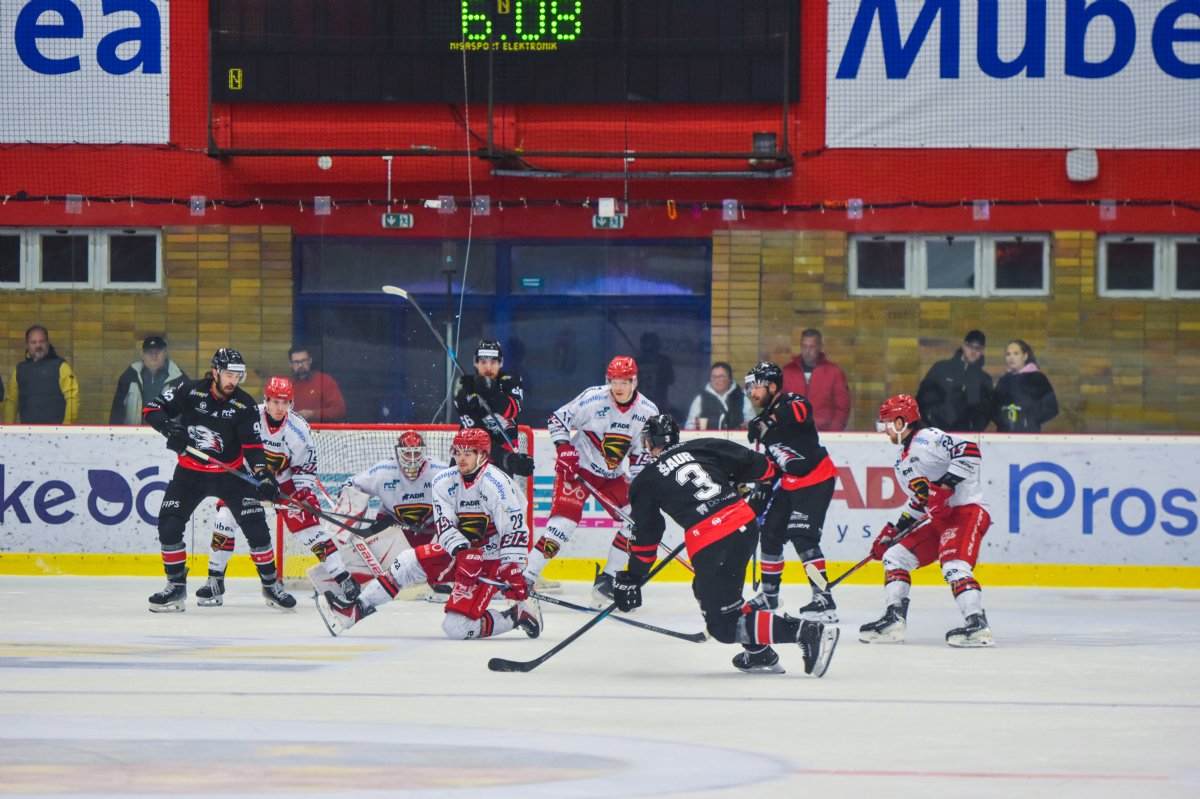 Třetí perioda nabídla nejatraktivnější podívanou. Už po necelé minutě hry z dorážky navýšil vedení Jestřábů Petr Gajda, když si nejlépe poradil v brankovišti po střele Michala Hoťka. Znojmo se po této brance snažilo zvednout, ale v zakončení se stále trápilo. Klíčovým momentem se zdála být situace ze 54. minuty. Po důrazném tlaku domácích se opět prosadil Rostislav Marosz, tentokrát z dorážky, a Prostějov už vedl 3:0. Zápas vypadal rozhodnutě, ale pak přišel závěrečný tlak Znojma. V 57. minutě nejprve Pavel Jenyš propálil Sajdla přes clonící hráče a vykřesal naději. O minutu později pak Petr Beránek dorazil vyraženou střelu a Znojmo bylo rázem zpět v utkání – 3:2. Závěrečné minuty byly dramatické. Znojemští hráli přesilovku a zároveň odvolali gólmana. V šesti proti čtyřem si vytvořili drtivý tlak. V největší šanci stál Zeman před odkrytou bránou, dále pokus Beránka nebo tlak Remty, ale skvělý Tomáš Sajdl v brance domácích odolal. V posledních vteřinách puk poskakoval před brankovou čárou, ale Jestřábi situaci ustáli a uhájili na domácí půdě tři body.