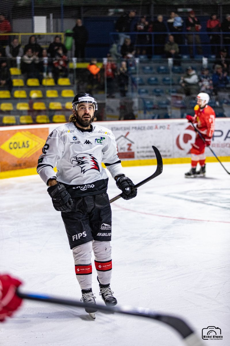 Do poslední třetiny vlétli Orli opět dvěma rychlými góly. Ten první, a zároveň už dnes jedenáctý, vstřelil z bezprostřední blízkosti Komínek, který stejně jako Bícha zároveň zkompletoval hattrick. Za pár chvil už ale sledoval, jak se po přesné nahrávce Bárty a svižné gólové střele opět raduje hokejista s číslem 92 – Mikuláš Bícha. V dalším průběhu třetí třetiny bylo na straně Znojma několik vyloučení, zde ale Opava početní výhodu znovu nevyužila. Devatenáct vteřin před koncem pak padl za záda střídajícího Pernici puk naposledy a znojemská Nevoga aréna potřinácté uslyšela gólovou sirénu, protože i Tomáš Komínek dal svůj čtvrtý gól v duelu, když využil šikovného pasu přes osu kluziště od Hodináře a puk uklidil do sítě. Zároveň tak ukončil znojemskou demolici, která svítila i na tabuli se skóre 13:1 ve prospěch domácího týmu.